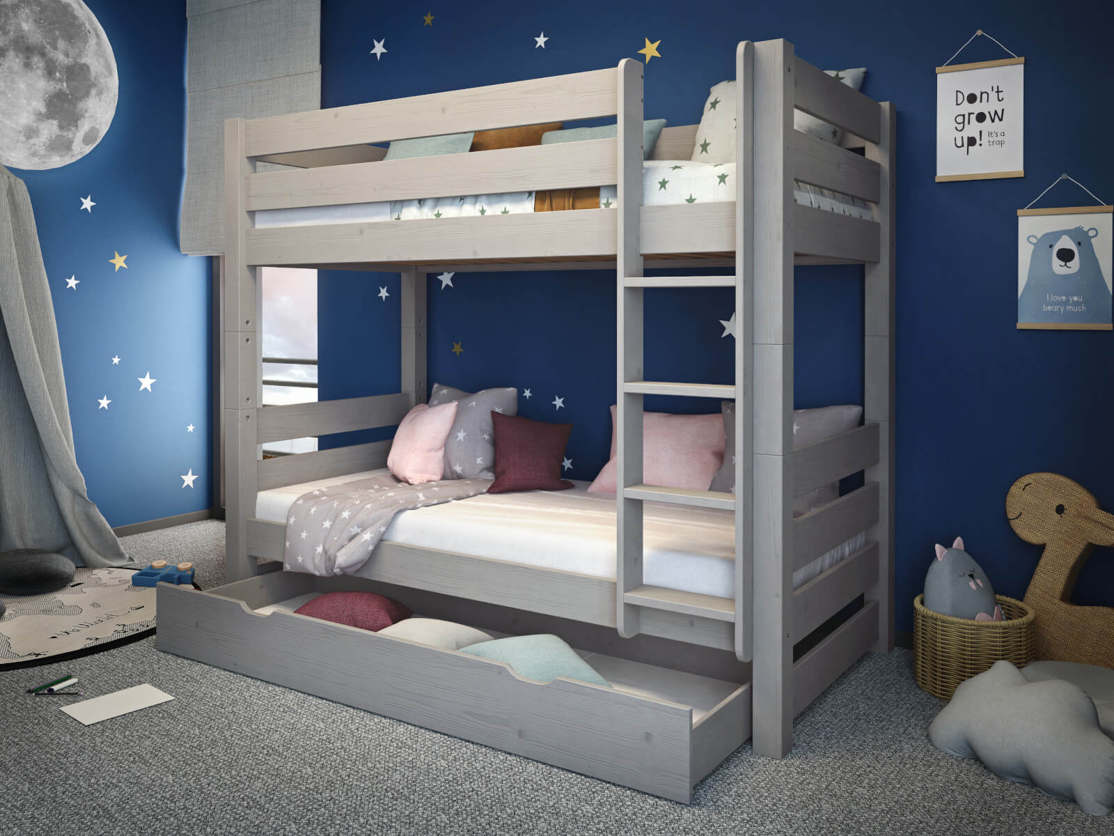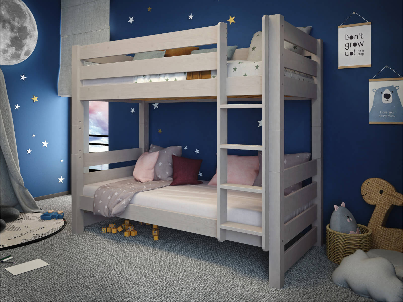 Προσφέρει άνετο ύπνο σε συνδυασμό με πρακτικότητα. Είναι κατασκευασμένη από μασίφ ξύλο πεύκου και έχει μεγάλη αντοχή στις φθορές. Ο σχεδιασμός της είναι ιδανικός για μικρούς χώρους και καλύπτει τις ανάγκες δύο παιδιών, ενώ η δυνατότητα διαχωρισμού σε δύο μονά κρεβάτια την καθιστά μια ευέλικτη λύση που προσαρμόζεται στις αλλαγές του παιδικού δωματίου.