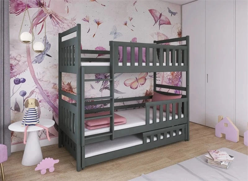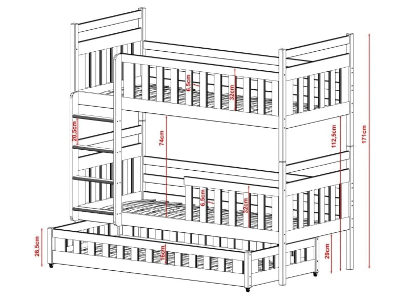 Η κουκέτα OLIWIA είναι η ιδανική λύση για οικογένειες με δύο ή τρία παιδιά. Με δύο επίπεδα ύπνου και ένα επιπλέον, συρόμενο κρεβάτι που αποθηκεύεται έξυπνα στο κάτω μέρος, προσφέρει τρεις άνετες θέσεις ύπνου χωρίς να καταλαμβάνει πολύτιμο χώρο στο παιδικό δωμάτιο. Ο κομψός σχεδιασμός της OLIWIA συνδυάζει λειτουργικότητα και στυλ, κάνοντάς την μια διαχρονική επιλογή για κάθε παιδικό χώρο.