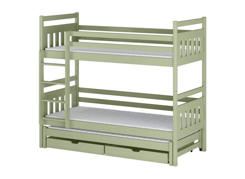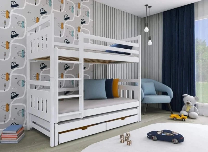 Η κουκέτα SEWERYN είναι η ιδανική λύση για δωμάτια όπου κάθε εκατοστό μετράει. Σχεδιασμένη για να εξοικονομεί χώρο, προσφέρει δύο κύριες επιφάνειες ύπνου και ένα τρίτο, συρόμενο κρεβάτι για φιλοξενούμενους ή καθημερινή χρήση. Η σταθερή κατασκευή από μασίφ ξύλο πεύκου εξασφαλίζει αντοχή και ασφάλεια, ενώ οι οικολογικές βαφές προστατεύουν την υγεία των παιδιών.