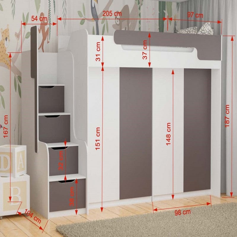 Υπερυψωμένο κρεβάτι DORIAN ΙΙΙ με διπλή ντουλάπα & σκαλοπάτια αποθήκευσης