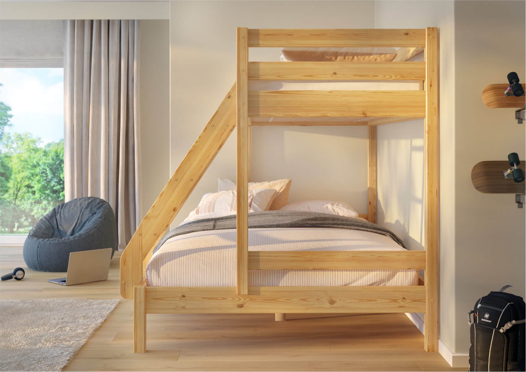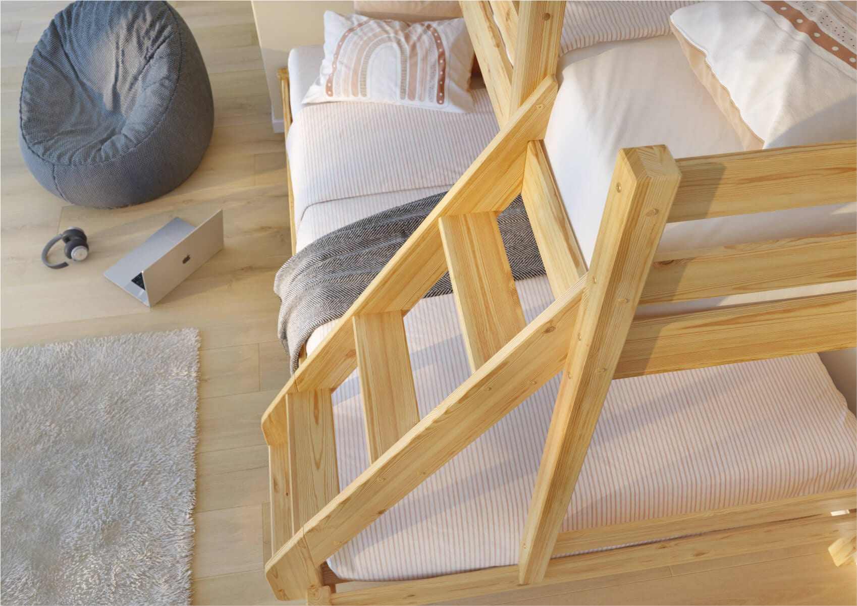 Το άνω κρεβάτι (90×200 εκ.) διαθέτει ψηλό προστατευτικό κάγκελο για απόλυτη ασφάλεια κατά τη διάρκεια του ύπνου και του παιχνιδιού. Το ευρύχωρο κάτω κρεβάτι (140×200 εκ.) μπορεί να φιλοξενήσει δύο άτομα, προσφέροντας απόλυτη άνεση.