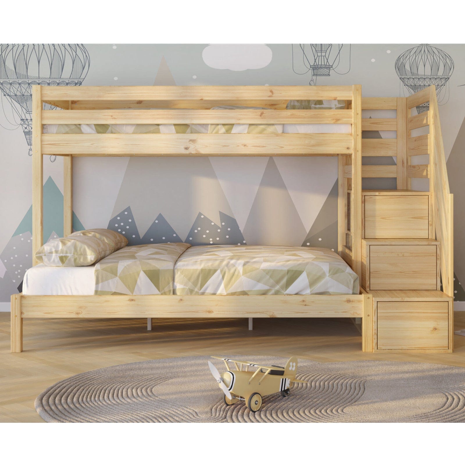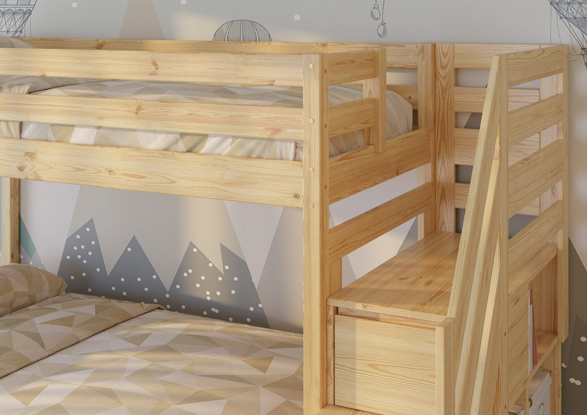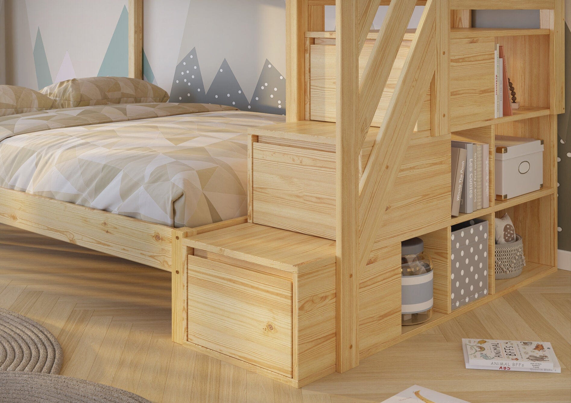 Η διάταξη της κουκέτας προσφέρει τρεις θέσεις ύπνου, ενώ η πλευρική σκάλα διαθέτει ενσωματωμένα συρτάρια και ράφια, προσθέτοντας πολύτιμο αποθηκευτικό χώρο χωρίς την ανάγκη επιπλέον επίπλων.