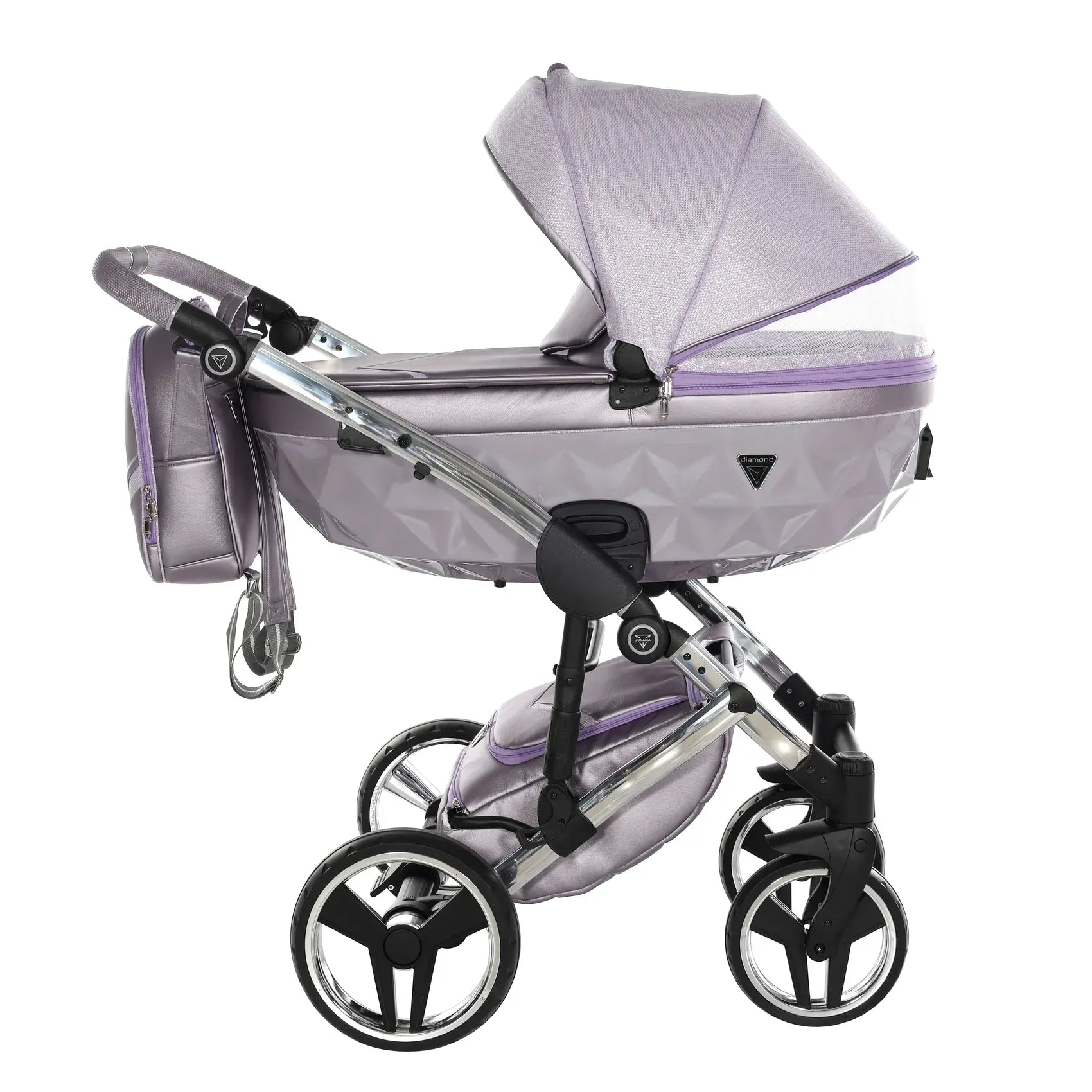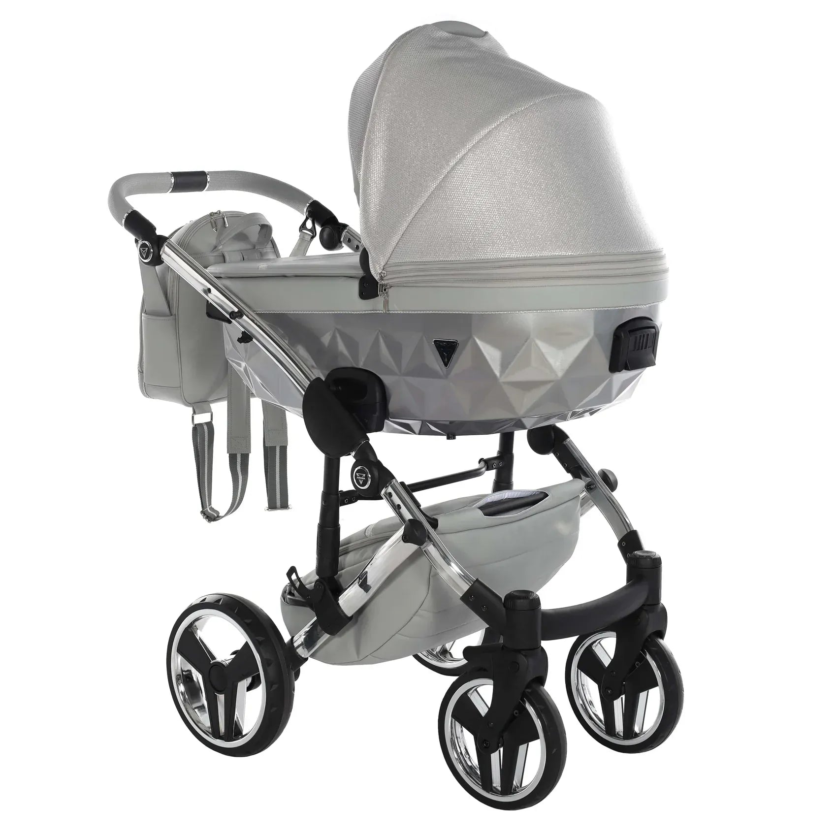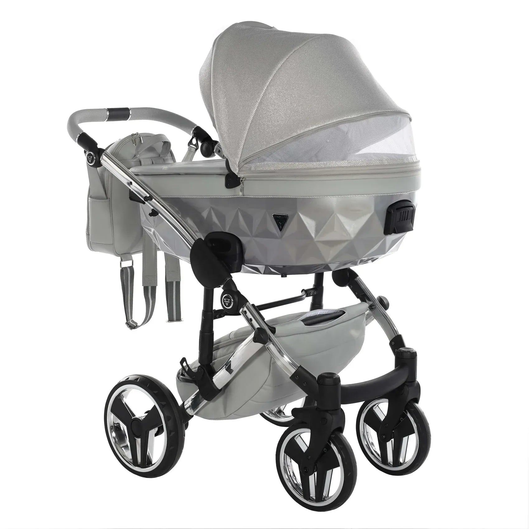 Στην καρδιά του Junama DOLCE βρίσκεται η χαρακτηριστική διαμαντόσχημη καλαθούνα, τοποθετημένη σε ένα υψηλής ποιότητας αλουμινένιο σασί που προσφέρει στιβαρότητα και κομψότητα. Οι λεπτομέρειες από οικολογικό δέρμα στη χειρολαβή, στη λαβή μεταφοράς και στο καλάθι αγορών ενισχύουν τον premium χαρακτήρα, ενώ το εσωτερικό της καλαθούνας είναι επενδυμένο με 100% βαμβάκι που αναπνέει, δημιουργώντας ένα άνετο και φιλικό περιβάλλον για το νεογέννητο.