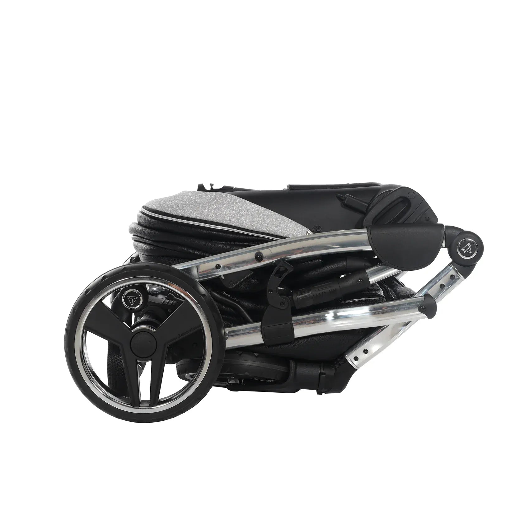 Η εργονομική λαβή και η λαβή μεταφοράς από οικολογικό δέρμα προσθέτουν πολυτέλεια αλλά και πρακτικότητα, ενώ ο συμπαγής μηχανισμός αναδίπλωσης επιτρέπει το δίπλωμα του καροτσιού ακόμη και με το κάθισμα προσαρτημένο, διευκολύνοντας την αποθήκευση και τη μεταφορά.