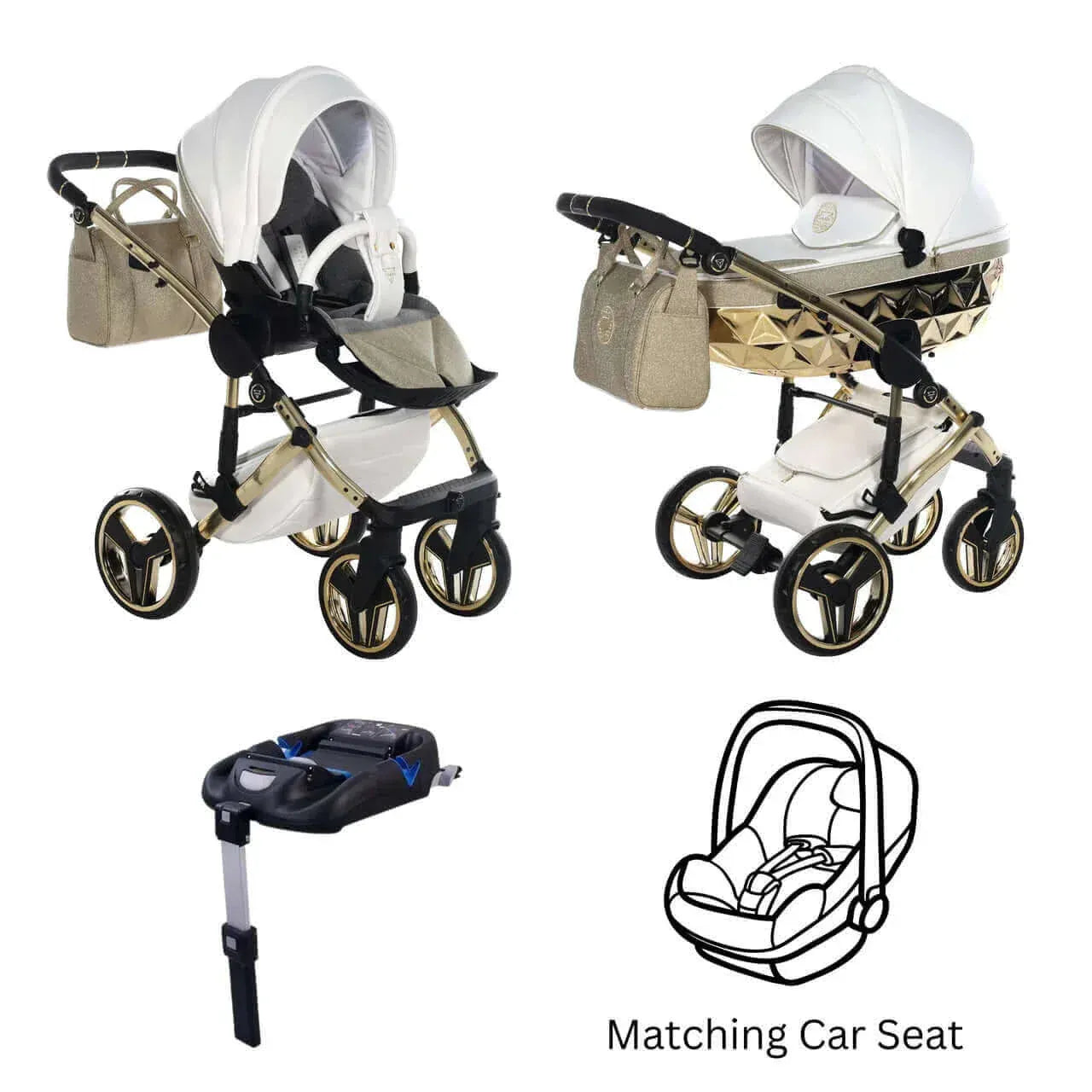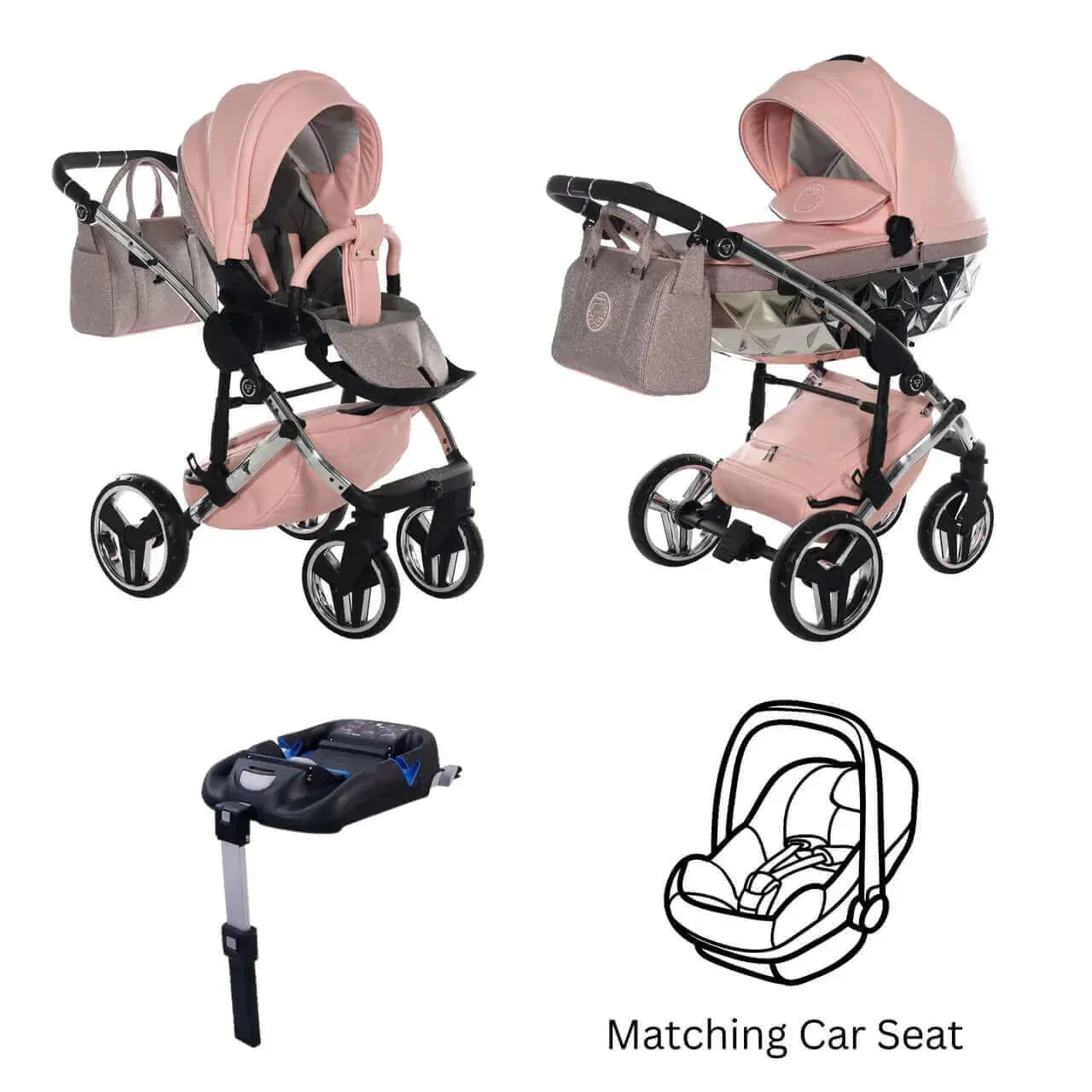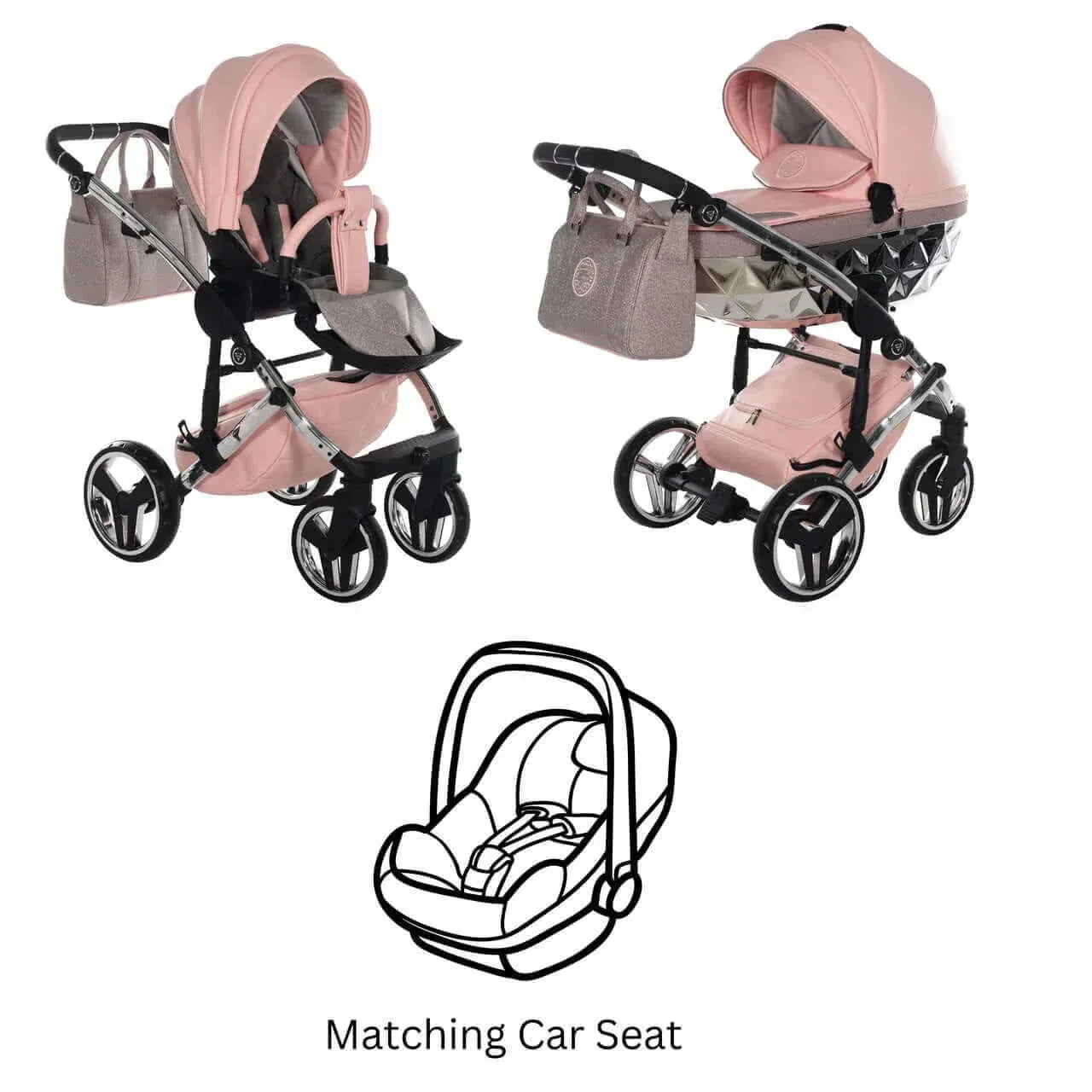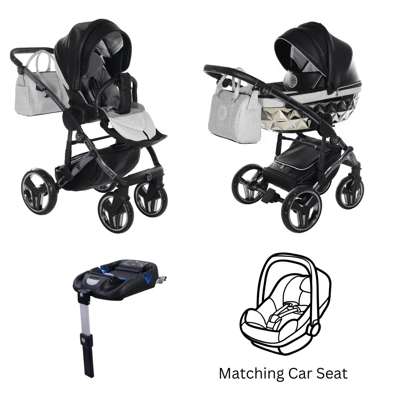 Το Junama Diamond Hand Craft Glitter V3 συνοδεύεται από πλούσιο σετ αξεσουάρ, ώστε κάθε έξοδος να είναι οργανωμένη και άνετη. Περιλαμβάνει τσάντα αλλαξιέρα Deluxe με στρωματάκι αλλαγής, κάλυμμα βροχής, κουνουπιέρα, ποτηροθήκη και κάλυμμα ποδιών. Στις εκδόσεις 3 σε 1 και 4 σε 1 μπορεί να συνδυαστεί με κάθισμα αυτοκινήτου και βάση ISOFIX, μετατρέποντας το καρότσι σε ολοκληρωμένο σύστημα ταξιδιού.