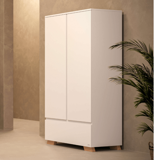 Πρακτική παιδική ντουλάπα με 2 εσωτερικά ράφια και 1 ευρύχωρο συρτάρι, ιδανική για την οργάνωση ρούχων, λευκών ειδών και όλων των απαραίτητων αξεσουάρ του μωρού.