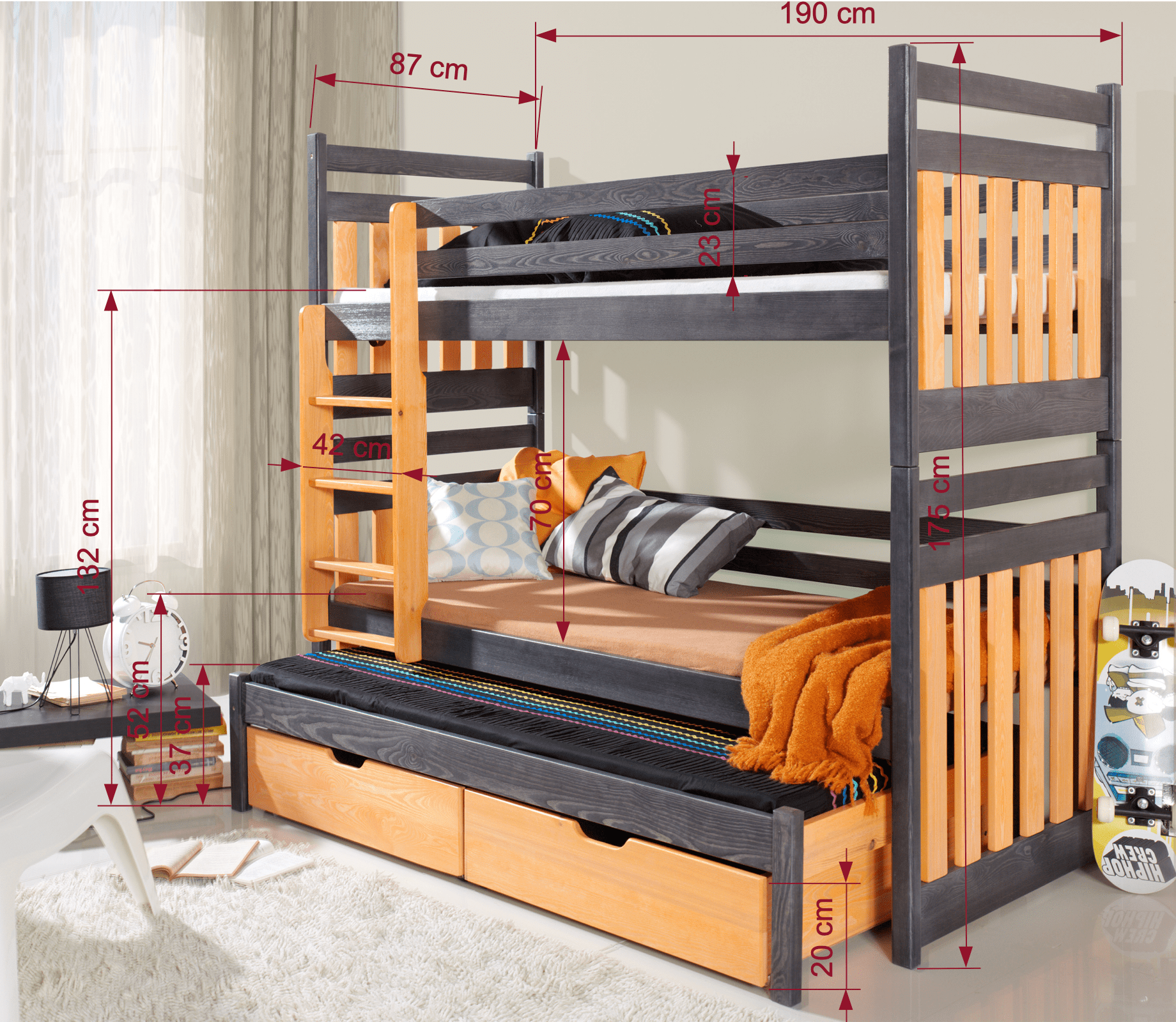 H κουκέτα SAMBOR είναι ιδανική για τρία παιδιά. Προσφέρει άνετο ύπνο σε συνδυασμό με πρακτικότητα. Είναι κατασκευασμένη από μασίφ ξύλο και έχει μεγάλη αντοχή στις φθορές. Περιλαμβάνει 2 ευρύχωρα συρτάρια & συρόμενο κρεβάτι.